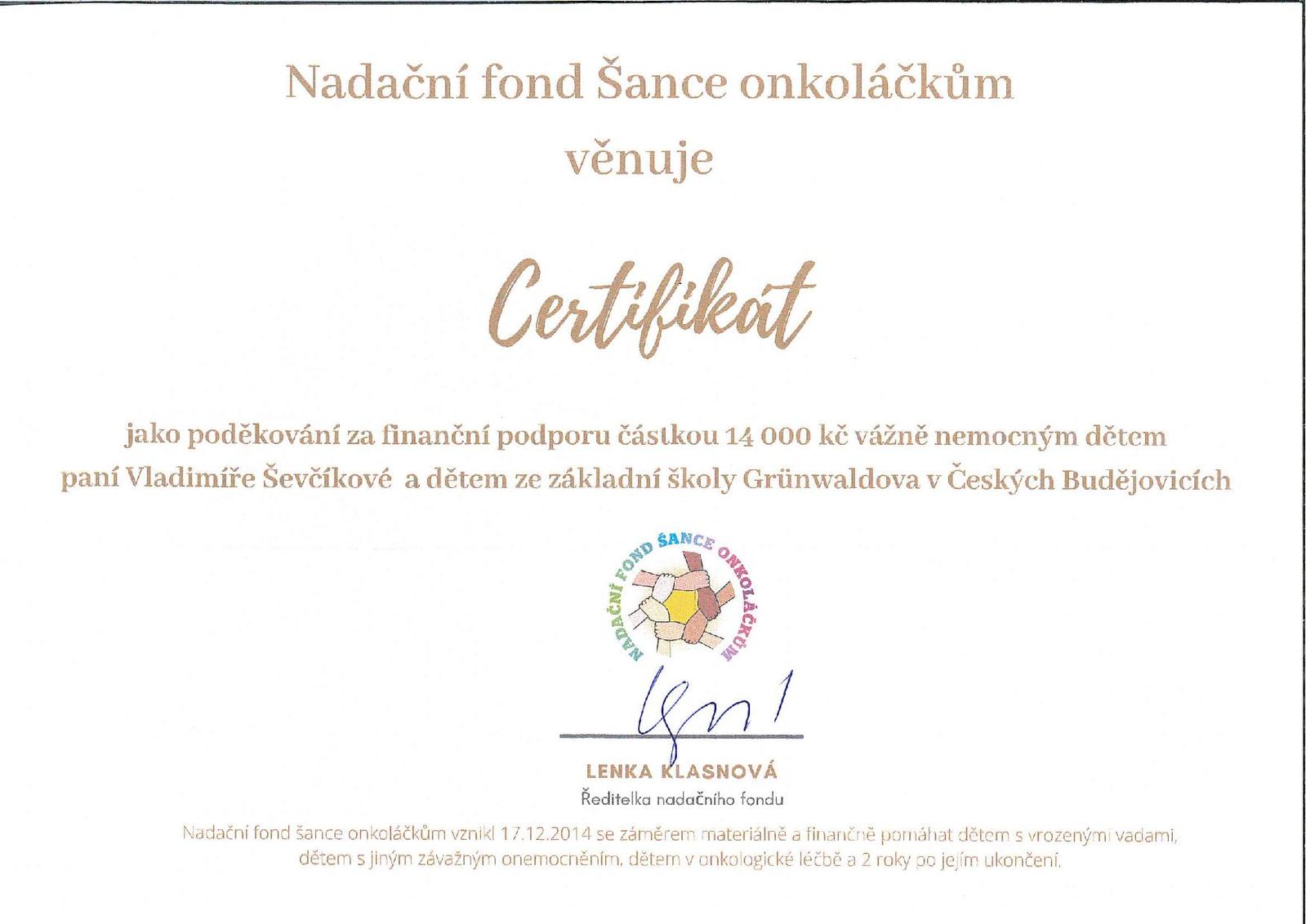Nadace nám poslala certifikát, na kterýmůžeme být náležitě pyšní.