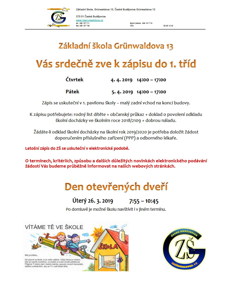 - Oznámení výsledků zápisu do 1. tříd pro školní rok 2019/2020: